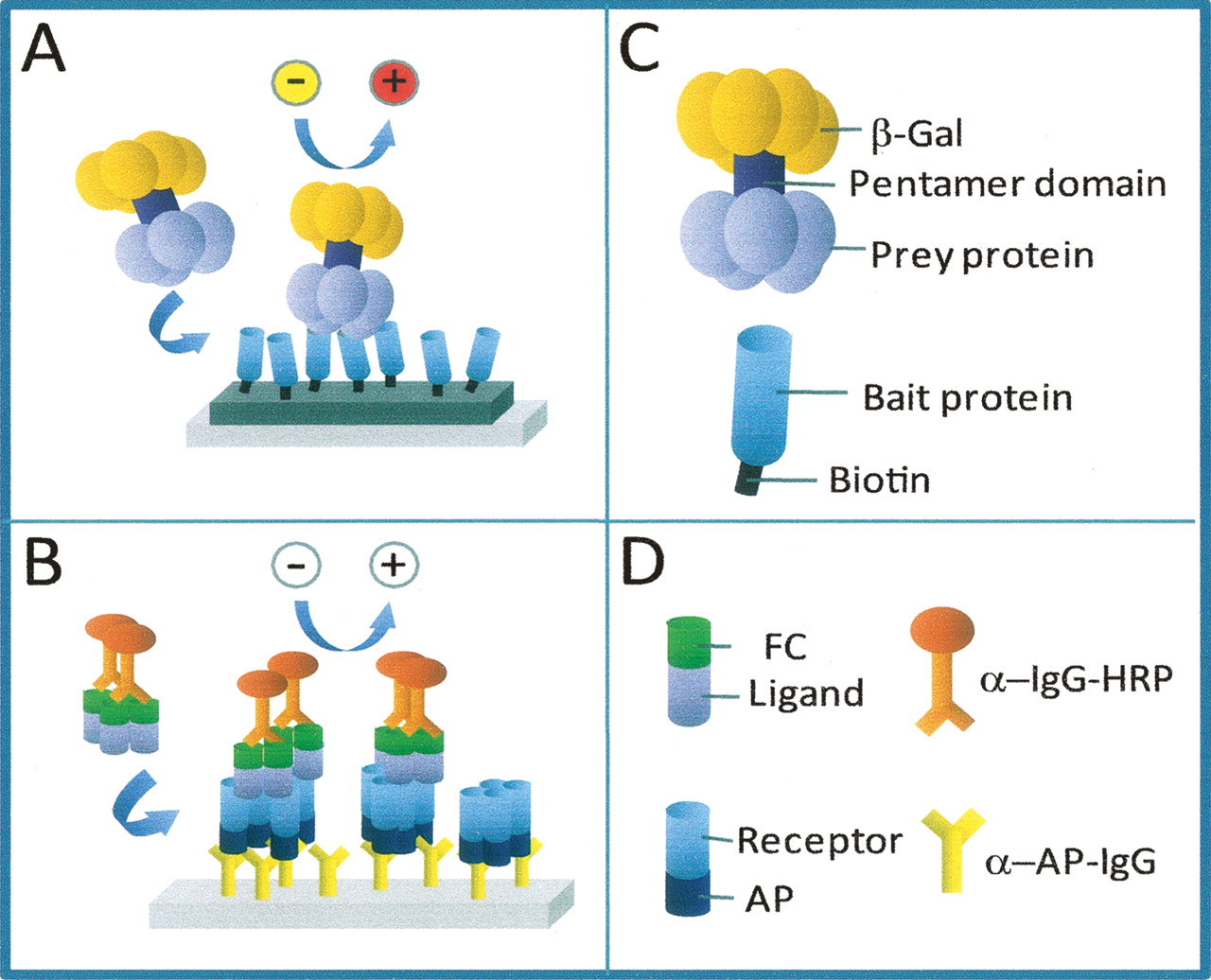Diagrammatic representation of the AVEXIS (A) and DSCAM (B) assay. A description of the molecular reagents used in each assay system is shown in panels C and D.