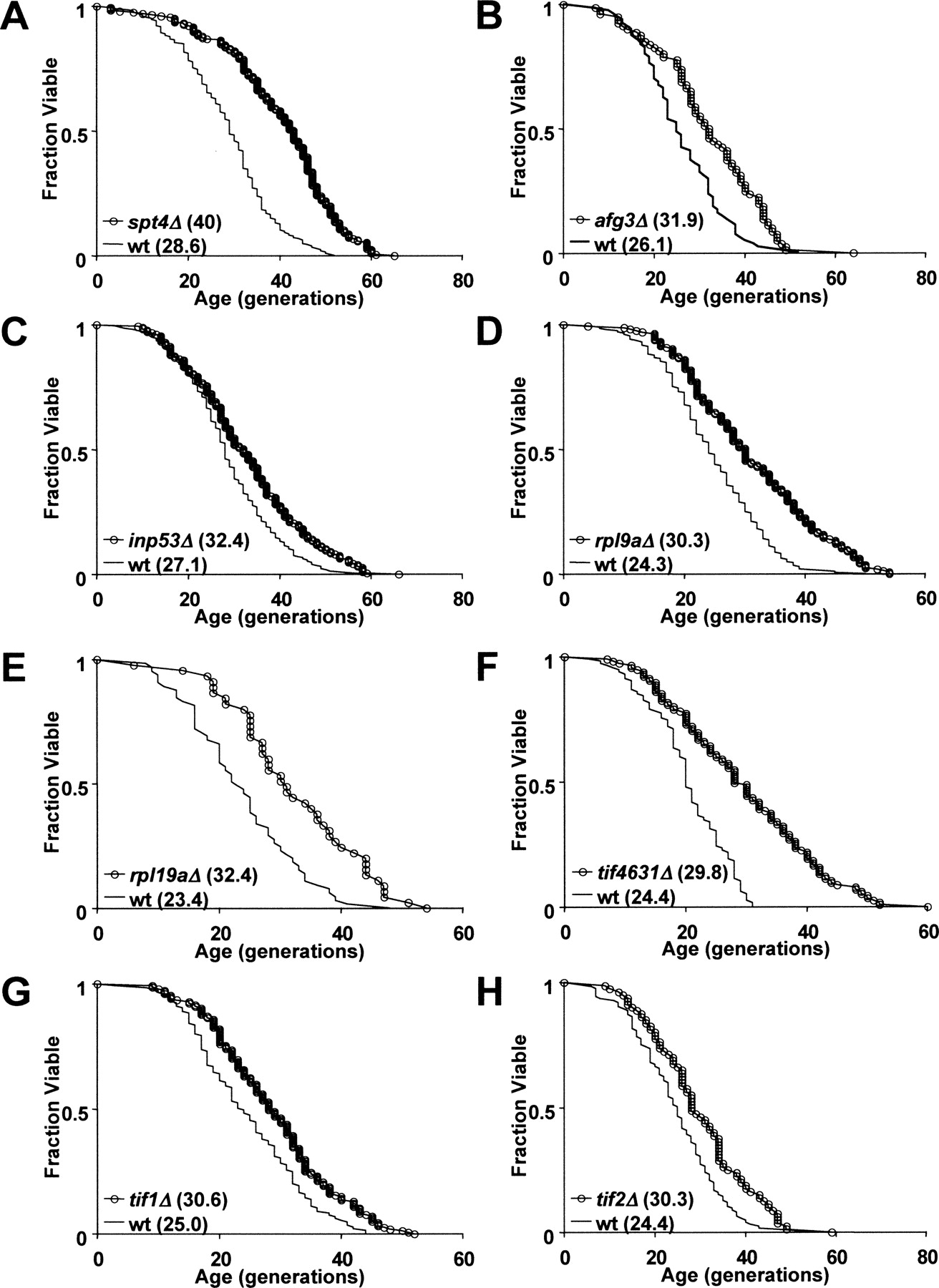 Novel modulators of yeast replicative life span (RLS). Replicative life span is significantly extended by deletion of 11 of 76 yeast ORFs in the RBH set, including the transcription elongation factor SPT4 (A), ATP-dependent metalloprotease AFG3 (B), inositol polyphosphate 5-phosphatase INP53 (C), ribosomal proteins RPL9A (D), and RPL19A (E), and translation initiation factors TIF4631 (F), TIF1 (G), and TIF2 (H). Deletion alleles of TOR1, RPL6B, and IDH2 have been previously shown to increase RLS (Kaeberlein et al. 2005). Mortality curves were generated from life span data in both the MATα and MATa mating types; the mean life span for each deletion strain and the experiment-matched wild-type (wt) control is given in parentheses in the key of each panel.