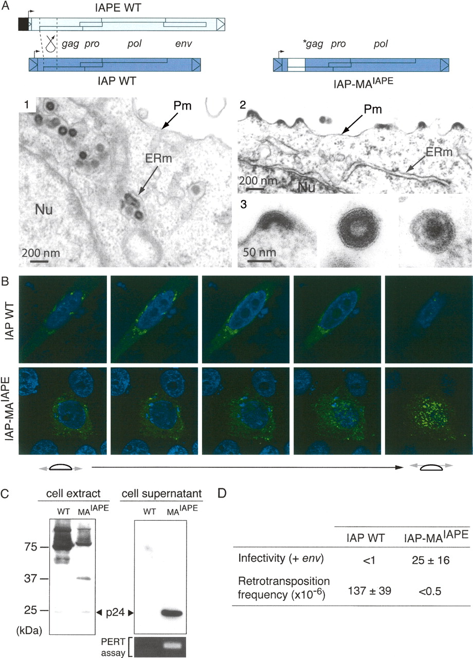 Recovery of an extracellular life cycle for an IAP chimera. (A) Structure of the wild-type and chimeric IAPs and morphology of associated VLPs. The IAP-MAIAPE element was constructed as illustrated by replacing the IAP Gag N terminus with that of IAPE. (1–3) Electron microscopy of 293T cells transfected with either wild-type or chimeric IAPs. (1) Representative low-magnification image of wild-type IAP particles accumulated in the cisternae of the ER. No particle can be observed at the cell membrane or in the extracellular space. (2) Low-magnification image of cells transfected with the chimeric IAP, disclosing particles budding at the cell membrane. No particle can be observed in the ER. (3) High-magnification images of chimeric IAP-associated particles. Images represent (from left to right) budding, free immature, and free mature particles. (B) Immunofluorescence confocal analysis of human HeLa cells transfected with wild-type or chimeric IAPs, fixed, permeabilized, and stained with the anti-Gag antibody (in green). Nuclei are stained with TO-PRO-3 iodide (in blue). (C) Western Blot analysis of whole-cell lysates or cell supernatants from 293T cells transfected with either the wild-type (WT) or the chimeric IAP (MAIAPE). (Bottom right) Detection of RT activity in the corresponding cell supernatant, using the PERT assay. (D) Functional characterization of wild-type and chimeric IAPs. For the intracellular retrotransposition assay, HeLa cells were cotransfected with the wild-type or chimeric IAP, and a neoTNF-marked defective IAP reporter in which a (backward) neomycin resistance gene—with the neo ORF interrupted by a (forward) intron—becomes functional only after splicing out of the intron, upon achievement of a complete replicative cycle. Retrotransposition events are detected upon G418 selection of the transfected cells, and frequencies are expressed as numbers of G418R clones per transfected cells in selection (mean values ± SD, n = 4); see Dewannieux et al. (2004) and Supplemental Figure S2 for a detailed description of the assay. For the infectivity assay, 293T cells were cotransfected with the same IAP plasmids as above, but with in addition the IAPE-D1 Env expression vector. Supernatants from the transfected cells were collected and used to infect naive HeLa cells, as in Figure 4A, and the viral titers were determined upon G418 selection of the target cells (mean values ± SD, n = 3).