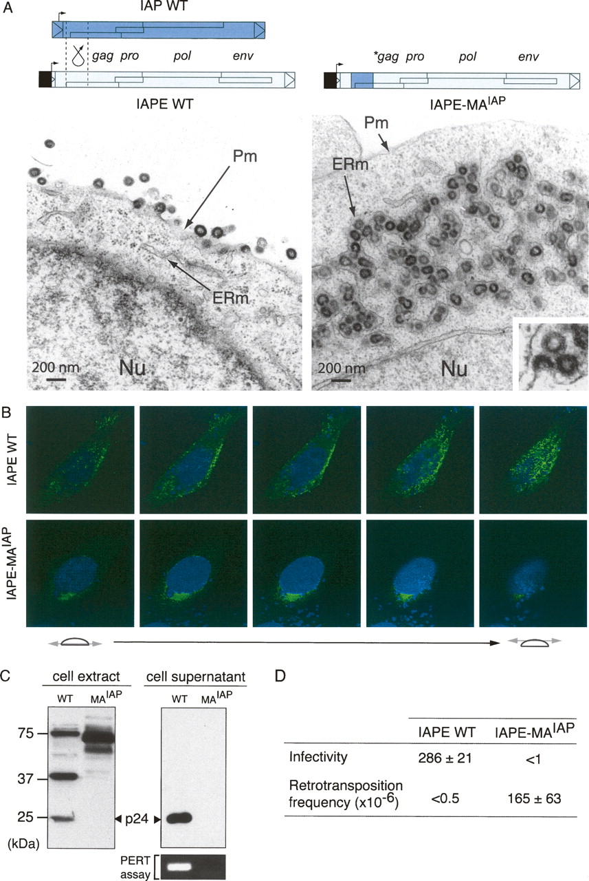 Structural and functional IAPE to IAP transition. (A) Structure of the wild-type and chimeric IAPEs and morphology of associated VLPs. The IAPE-MAIAP element was constructed as illustrated by replacing the IAPE Gag N terminus with that of IAP. Representative low-magnification images of 293T cells transfected with the wild-type IAPE disclose particles budding at the cell membrane (left). No particle can be observed at the level of the ER. Low-magnification images of cells transfected with the chimeric IAPE (right) disclose particles accumulated in the cisternae of the ER, with a high-magnification image of a particle budding into a cisternae (bottom right inset). No particle can be observed at the level of the cell membrane. (B) Immunofluorescence confocal analysis of human HeLa cells transfected with wild-type or chimeric IAPEs, fixed, permeabilized, and stained with the anti-Gag antibody (green). Nuclei are stained with TO-PRO-3 iodide (blue). (C) Western blot analysis of whole-cell lysates or cell supernatants from 293T cells transfected with either the wild-type (WT) or the chimeric IAPE (MAIAP). (Bottom right) Detection of RT activity in the corresponding cell supernatant, using the PERT assay. (D) Functional characterization of wild-type and chimeric IAPE. Infectivity was assayed as in Figure 4 either with the wild-type or the chimeric IAPE (mean values ± SD, n = 3). For the retrotransposition assay, HeLa cells were transfected with the wild-type or chimeric IAPE element in which the neoTNF indicator gene was inserted into the env gene, thus rendered defective (see structures in Supplemental Fig. S2). Retrotransposition frequencies were determined upon G418 selection of the transfected cells, as in Figure 5D (mean values ± SD, n = 3).