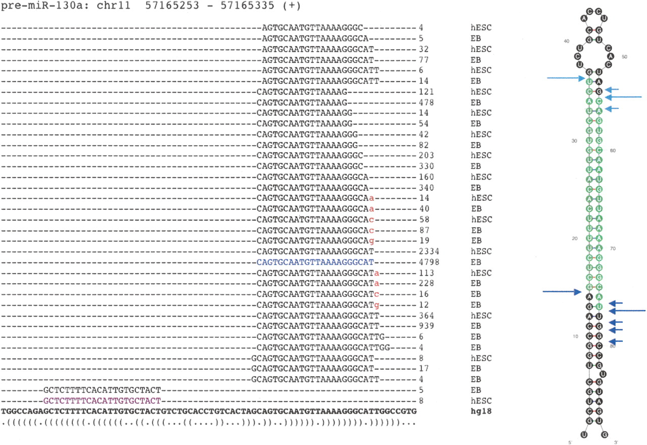 The repertoire of isomiRs and 3′ modifications of hsa-miR-130a. A diverse variety of isomiRs were observed for many of the known and novel miRNAs. Sequences representing the miR* were also commonly observed (highlighted in purple). The reference miRNA sequence from miRBase was, in many cases, not the most frequently observed isomiR (shown in blue). In this example, the most abundant miR* did not correspond to the current miRBase entry, although within the predicted pre-miRNA structure it derives from the correct 2-nt offset position relative to the reference miRNA (far right). Although variation at the 3′ end is generally much more common than at the 5′ end, target preference of the 5′ isomiRs may differ. Sequences with evidence of 3′ additions of nucleotides (red) were common, with certain miRNAs more heavily modified than others (summarized in Supplemental Table 4). The predicted structure of the pre-miRNA is represented at the bottom in dot-bracket notation, and as a graphic (far right). Experimentally inferred Drosha and Dicer1 cleavage positions are indicated in dark and light blue arrows, respectively. Large arrows represent cleavage sites for the most abundant isomiR whereas small arrows indicate those for the other isomiRs.