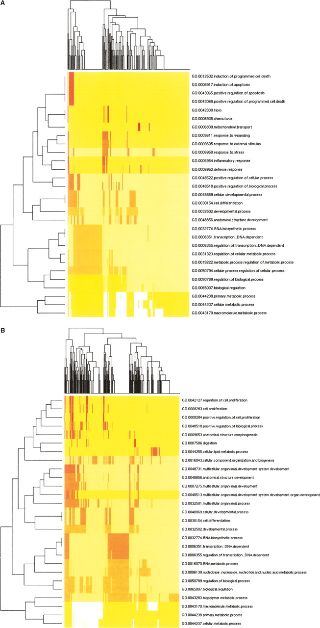 Clustering of over-represented Gene Ontology (GO) classes in predicted targets of differential microRNAs. Shown are heat map representations of GO (Ashburner et al. 2000) terms over-represented among predicted cooperative targets (Y-axis) of hESC-enriched miRNAs (A) and EB-enriched miRNAs (B). All genes with statistically over-represented GO annotations were included (P < 0.01, X-axis) as identified by GoStat (Beissbarth and Speed 2004). GO terms common to both sets of genes were those involved in transcriptional regulation, differentiation, and development. Those GO terms unique to hESC-enriched miRNA targets were associated with programmed cell death, response to stress, and cell motility while those unique to EB-enriched miRNA targets describe various aspects of cell proliferation regulation as well as nucleotide and nucleic acid metabolism.