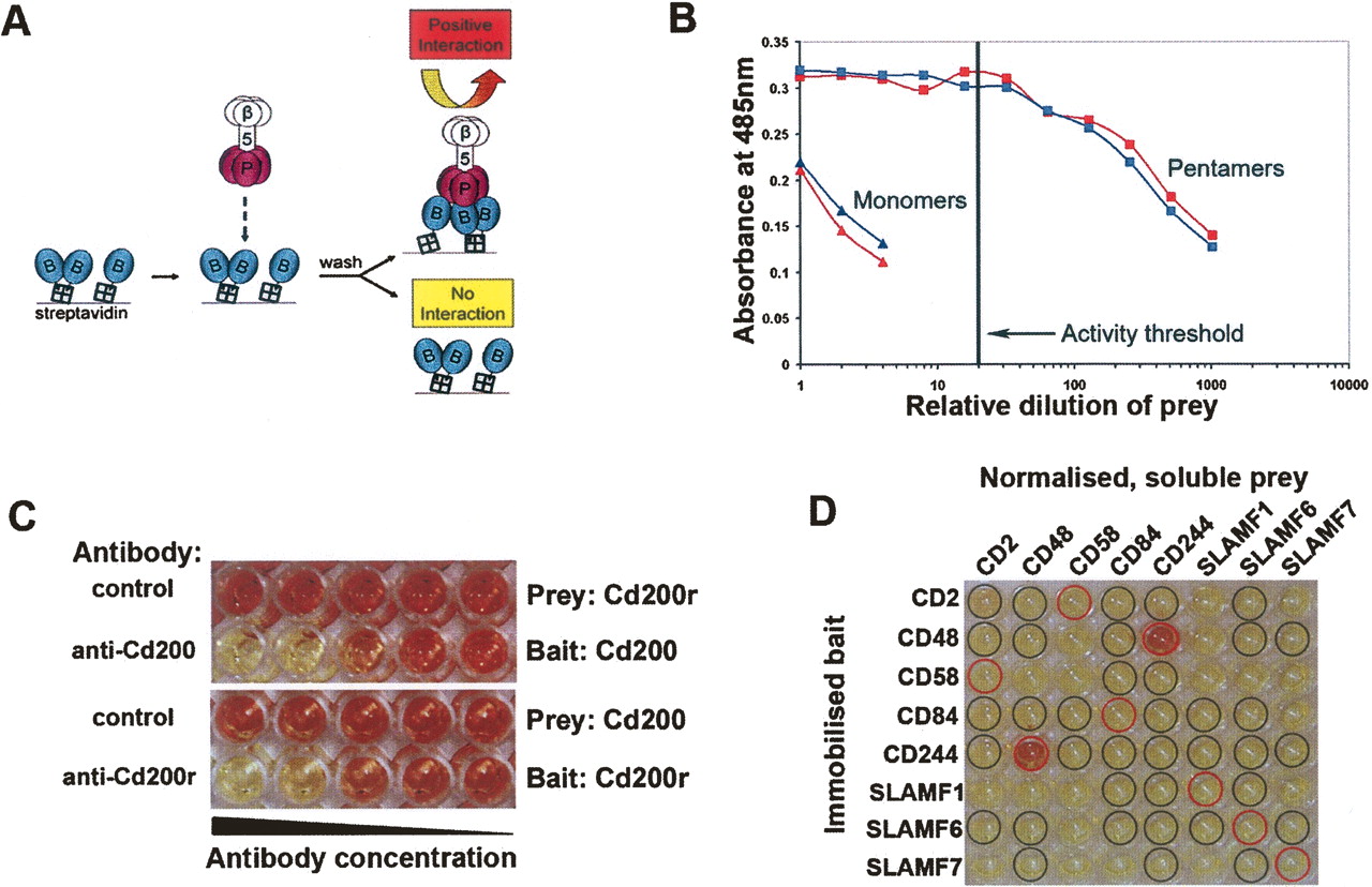 AVEXIS specifically detects low-affinity extracellular interactions with a low false-positive rate. (A) Schematic representation of AVEXIS. Biotinylated bait ectodomains (blue) are captured in an orientated manner on a streptavidin-coated microtiter plate and probed with soluble pentameric β-lactamase-tagged prey ectodomains (pink). Positive binding is detected by colorimetric enzymatic turnover of nitrocefin (yellow to red). (B) Pentamerization increases the avidity of prey ectodomains. Pentameric (squares) and monomeric (triangles) Cd200 (blue) and Cd200r (red) prey constructs were normalized for β-lactamase activity, serially diluted, and tested against the appropriate bait construct. The prey activity threshold used for AVEXIS is shown, corresponding to 50 units/mL. (C) AVEXIS interaction specificity. (Top panel) Low-affinity Cd200 (bait)–Cd200r (prey) interaction can be detected in the presence of a non-binding control antibody but is specifically blocked with an anti-Cd200 blocking monoclonal antibody; the blocking effect can be titrated by decreasing antibody concentration. The interaction specificity is independent of bait–prey orientation and can also be blocked with an anti-Cd200r antibody, bottom panel. (D) AVEXIS false-positive and -negative rate evaluation. An AVEXIS screening plate with bait proteins arrayed in rows and the prey proteins normalized to threshold levels in columns; positive binding results can be seen as red wells. Expected positive and negative wells are circled in red and black, respectively.