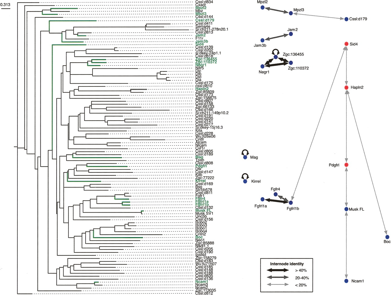 Interactions between paralogous proteins are enriched within the extracellular interaction network. A phylogenetic tree showing the relationships of the non-redundant protein ectodomains used within the screen is shown. Names and branches representing the interacting proteins from the network are highlighted in green. The line widths in the interaction network reflect the sequence identities between interacting proteins as described in the key. Homophilic interactions are shown for completeness.