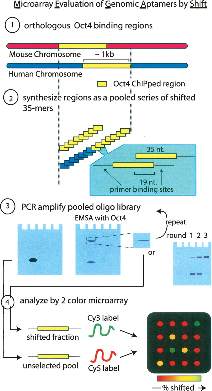 MEGAshift protocol. (Step 1) All orthologous genomic regions enriched in both human and mouse POU5F1 (Oct4) ChIP experiments were aligned and resynthesized (step 2) as a tiled contig of 35-mers flanked by universal primer binding sites. The human genomic region was extended to cover the union of this overlap. (Step 3) This pool was amplified with labeled primers migrates as a single band and was then used in an EMSA activity with recombinant POU5F1. The shifted band was excised, reamplified, and either reshifted or analyzed by cloning or microarray. (Step 4) Microarray analysis. Shifted and unselected fraction were reamplified and the T7 containing template used to generate Cy3 (shifted) or Cy5 (unselected) targets for the custom oligonucleotidearray.