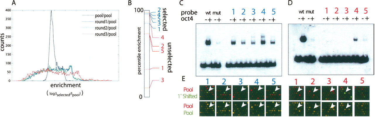 Changes in oligonucleotide enrichment throughout an POU5F1 SELEX experiment. (A) Enrichment scores for each round of SELEX were binned and graphed as a histogram. (B) Average enrichment scores were ranked with relevant oligonucleotides marked on the percentile bar. Gel shift assay was repeated for isolates cloned from selected (C) and unselected (D) fractions. (E) Microarray images corresponding to pool/pool and pool/round1 are drawn below the gel lane for each oligonucleotide.