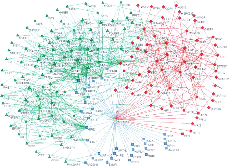 A protein interaction network for Huntington disease. (Red diamonds) Y2H interactors of huntingtin (HTT) newly identified by the Goehler et al. (2004) study. (Blue squares) Previously published interactors. (Green triangles) Interactors culled from human protein interaction databases (HRPD) (Gandhi et al. 2006), MINT (Chatr-aryamontri et al. 2007), and BIND (Bader et al. 2003). (Red squares) HTT interactors that were both newly identified and previously reported. Reproduced from Goehler et al. (2004) and reprinted with permission from Elsevier Ltd. © 2004.