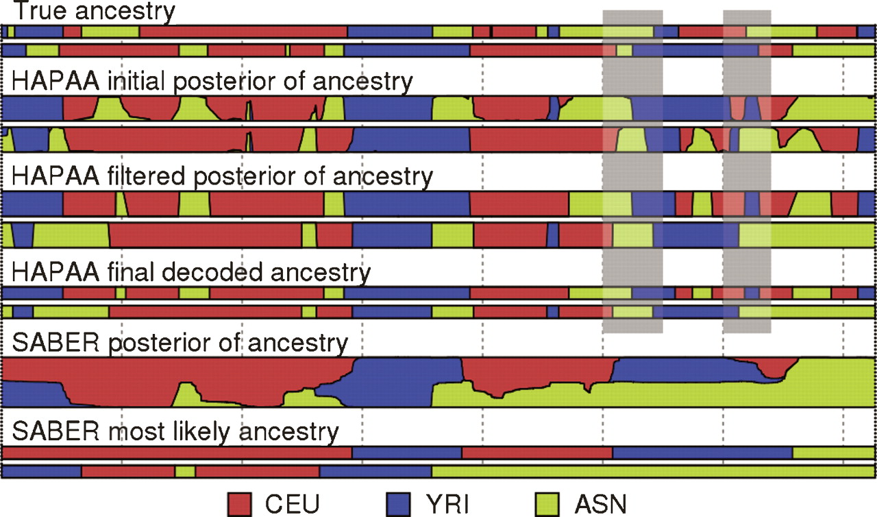 Example inference on chromosome 22 of an individual admixed between three HapMap populations. The top two tracks represent the true ancestries, followed by three stages of HAPAA processing, and finally posterior probabilities and Viterbi decoding by SABER. The gray bars highlight two locations with correctly inferred ancestry but with phase switching errors between the haplotypes.
