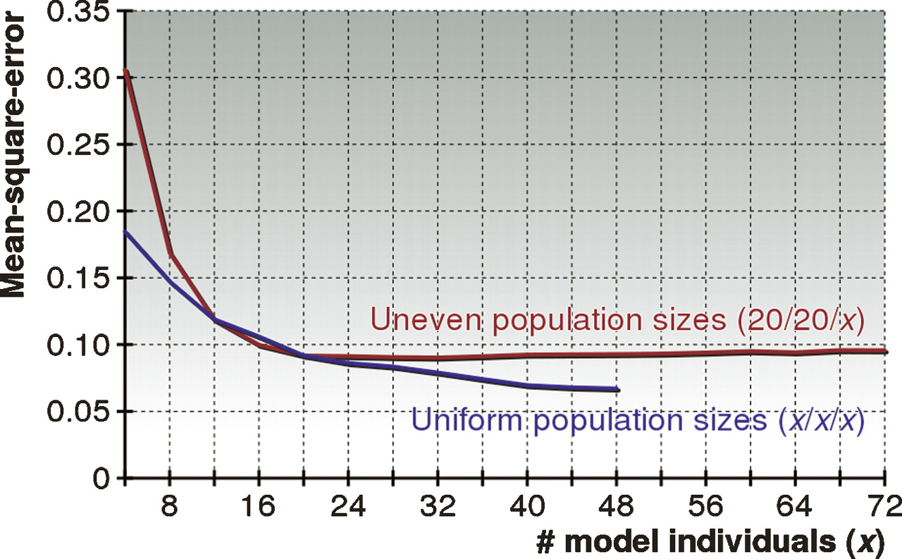 Performance of HAPAA when varying the number of model individuals. We created models with a varying number of individuals derived from three populations in the HapMap data set within chromosome 22. For the “Uniform population sizes” we randomly picked x ∈ {4, 8, . . . , 48} individuals to model each population, while for the “Uneven population sizes” we picked 20 individuals from CEU and YRI and x ∈ {4, 8, . . . , 72} individuals from the ASN population. We benchmarked the mean-square-error performance of HAPAA on 1000 test individuals admixed over G ∈ {1, 2, . . . , 20} generations from the three populations.