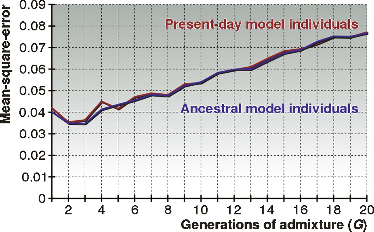 Performance of HAPAA when using ancestral versus present-day model individuals. For each G ∈ {1, 2, . . . , 20} we constructed (1) a set of unrelated ancestral individuals by randomly selecting 45 from each HapMap population and (2) 45 unrelated present-day model individuals for each population. Present-day individuals were generated over G generations of random mating using HapMap samples as templates. We tested on chromosome 22 on individuals admixed from the three populations over G generations using the mean-square-error metric.