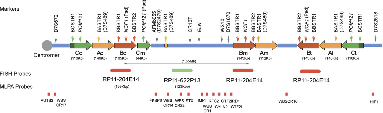 Schematic representation of the genomic structure of the WBS locus at 7q11.23. There are three large segmental duplications or LCRs—centromeric (c), medial (m), and telomeric (t)—each of which is composed of three distinct blocks—A, B and C—represented by colored arrows that indicate their relative orientation with respect to each other. The most common WBS 1.55-Mb deletion arising from NAHR between blocks B is indicated. Note that block Cm is much shorter than blocks Cc and Ct, missing the darker green region that harbors BCSTR1. The locations of the relevant multiple- and single-copy markers used in this study are indicated on top of the scheme, while the MLPA probes and the BACs used as FISH probes are shown at the bottom.