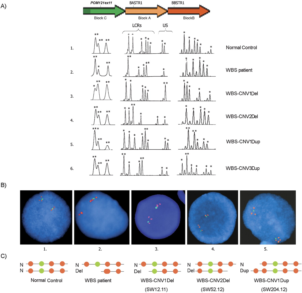 Characterization of the 7q11.23 CNVs by quantitative PCR-based methods and FISH. (A) Representative genotypes at the multiple-copy PSV (indel at exon 11 of POM121, block C) and microsatellites BASTR1 (block A) and BBSTR1 (block B) in individuals with different CNVs. Individual 1 is a normal control, carrying six alleles per LCR block and two alleles at the WBS region. BASTR1 shows eight alleles because it recognizes four loci, one deleted in WBS patients (D7S489B), and three located in blocks A. BBSTR1 recognizes three loci, one from each block B. Individual 2 is a WBS patient with the most common 1.55-Mb deletion that leads to the loss of one block B and the entire single-copy region in between. Individuals 3 and 4 carry deletion-type CNVs resulting in deletion of the centromeric-type blocks C, A, and B (3, WBS-CNV1Del) or of only the telomeric-type blocks A and B (4, WBS-CNV2Del). Individuals 5 and 6 carry duplication-type CNVs including all three blocks sequences (5, WBS-CNV1Dup) or just block B (6, WBS-CNV3Dup). Asterisks over each peak indicate the number of alleles, as predicted by dosage analysis (US, unique sequence). The predicted number of alleles is indicated by asterisks on top of each peak. (B) Dual-color interphase FISH in nuclei from the same individuals 1–5 with BACs RP11–204E14 (BZ724405) (block B), and RP11–622P13 (AC073846) (WBS region), giving red and green signals, respectively. Individual 1 shows the normal pattern in both chromosomes. Individual 2 shows a deletion of the green probe and a red signal in one chromosome due to a deletion mediated by inter-block B recombination. In individual 3, a red spot in one chromosome is missing due to deletion of block Bc, while in individual 4 the missing signal corresponds to a block B located at telomeric side. Individual 5 shows an extra signal in one chromosome corresponding to an additional block B present at the centromeric side. (C) Schematic representation of the hypothetical structure of the region as shown by FISH signals.