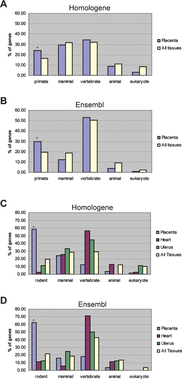 Primate-specific genes enriched in human mature placenta, indicating conservation of a gene duplication mechanism. Evolutionary origins of genes with PlacPEM ≥4 in mature placenta samples from the unscaled Novartis GeneAtlas human and mouse datasets using either Homologene (A) or Ensembl (B). Asterisks (*) indicate significant enrichment over background (All Tissues). In human, the GeneAtlas mature placenta gene set demonstrates significant enrichment of primate specific genes according to Homologene (P < 0.05) and Ensembl (P < 0.01). The GeneAtlas mature placenta gene set for the mouse is significantly enriched for rodent-specific genes according to both Homologene (P < 1.0 × 10−11) (C) and Ensembl (P < 1.0 × 10−11) (D). Genes with HeartPEM ≥ 4 (i.e., genes for which the heart expression level divided by the average expression is ≥4), UterusPEM ≥ 4, or PEM ≥ 4 in any tissue are included for comparison.