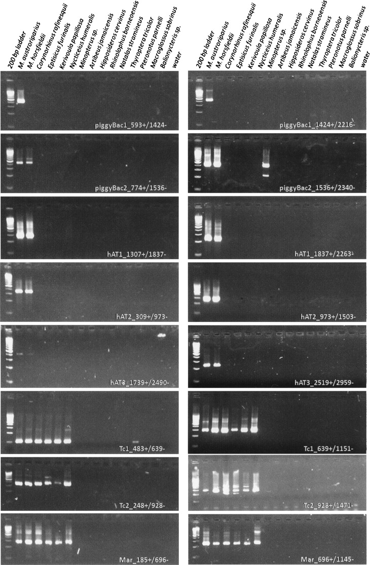 Electropherogram results from PCR analysis of a taxonomically diverse panel of bat genomes. Oligonucleotide primer pairs are indicated in white.