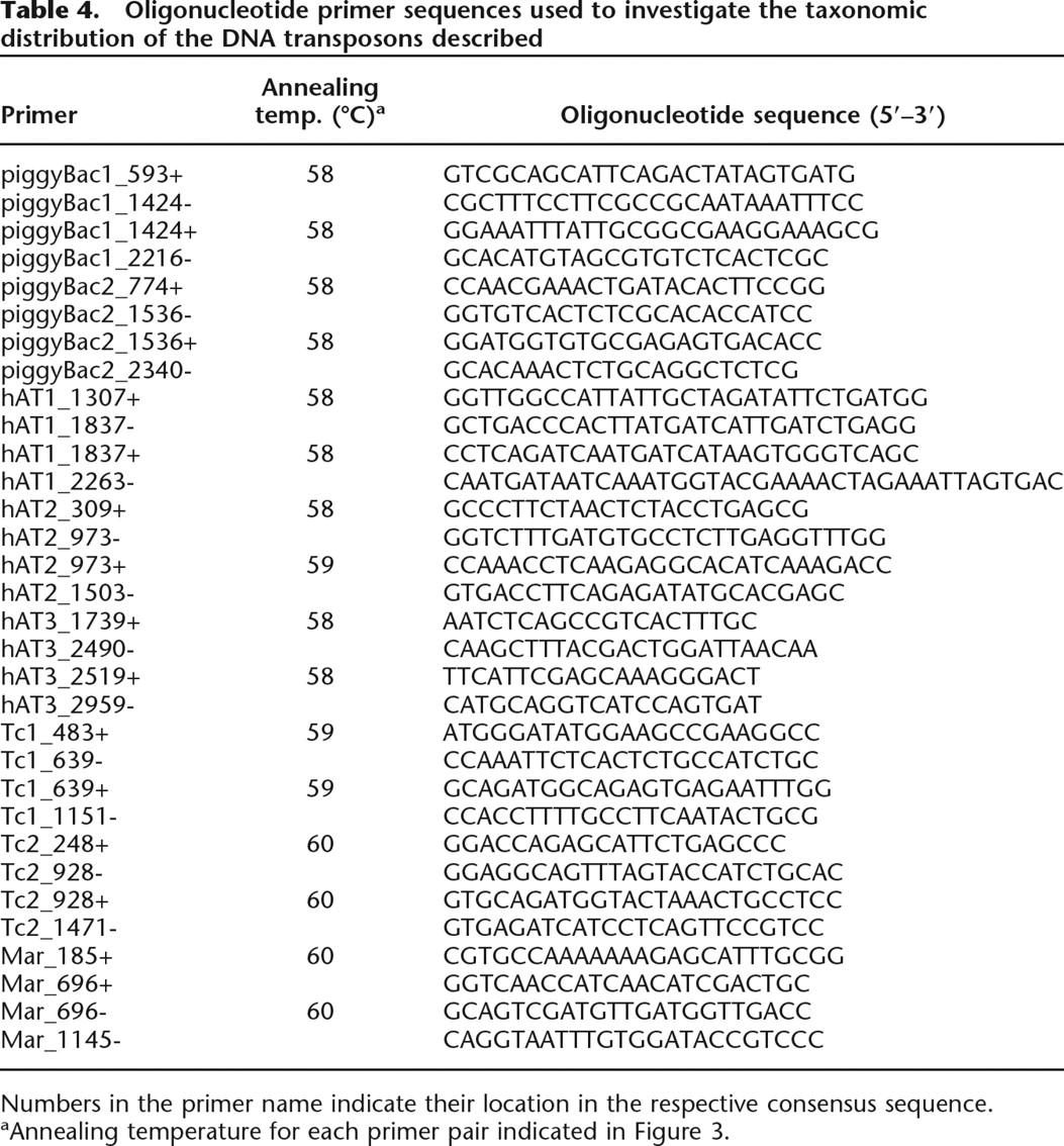 Oligonucleotide primer sequences used to investigate the taxonomic distribution of the DNA transposons described