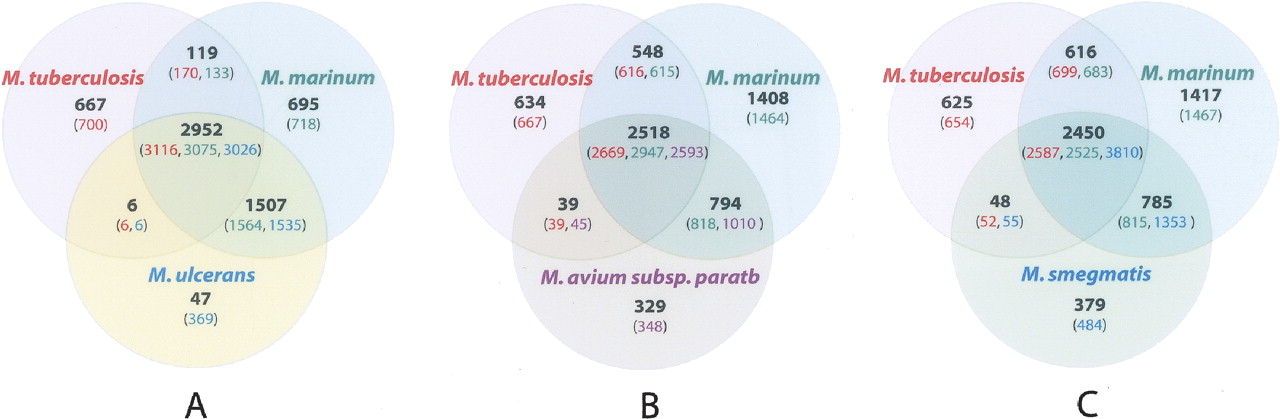 Venn diagrams showing orthologous CDS among four mycobacterial species as determined by BLASTCLUST analysis. Numbers in parentheses include paralogous CDS.