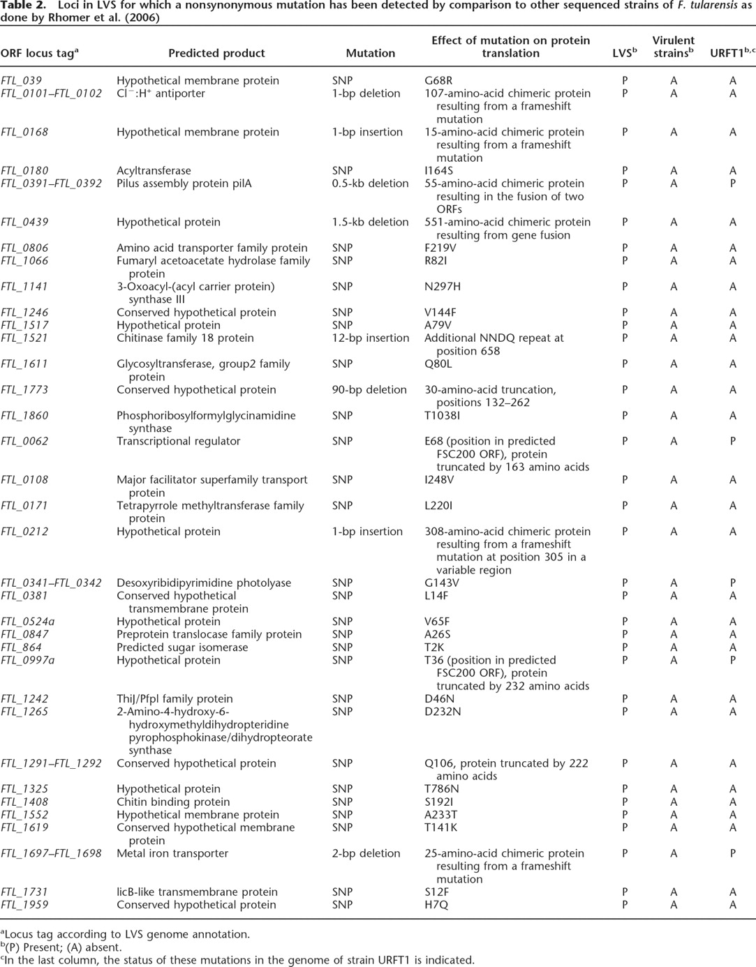 Loci in LVS for which a nonsynonymous mutation has been detected by comparison to other sequenced strains of F. tularensis as done by Rhomer et al. (2006)