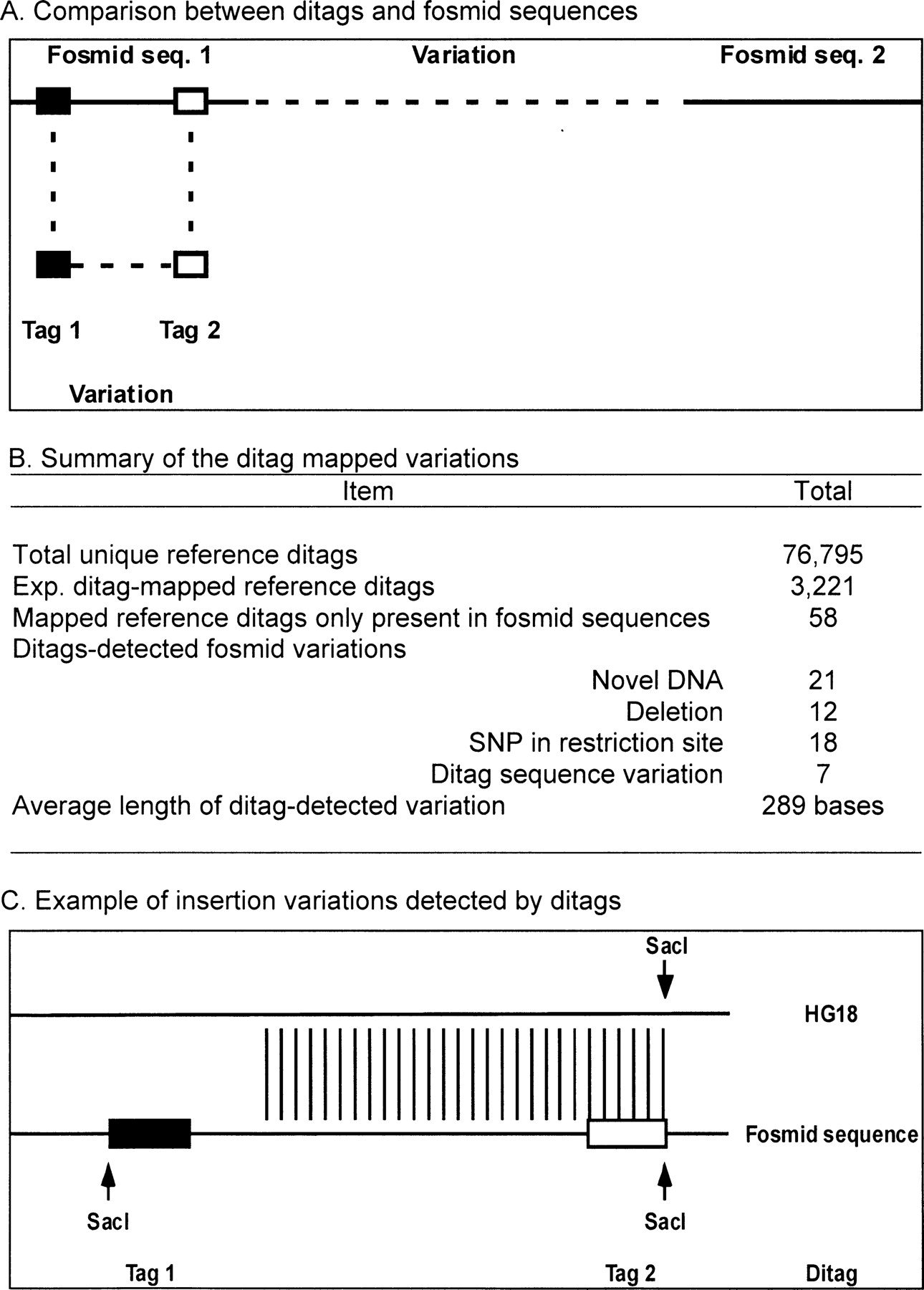 New variations identified by GM15510 ditags. (A) Comparison between ditags and fosmid sequences. Reference ditags were extracted from fosmid sequences with two restriction sites. Experimental ditags not mapped to HG18 were compared with the fosmid reference ditags to identify the variations within the fosmid sequences. (B) Summary of the results. Comparing the GM15510 experimental ditags to the reference ditags of GM15510 fosmid sequences identified 55 variations. (C) Example of an insertion variation detected by a ditag. This insertion was identified in a fosmid sequence (TI number 146956937) by a ditag AAGCTTTAACACCGTG/GTTTCTTCAAAAGCTT (See Supplemental Table 4). The tag 1 was released from a SacI site in the fosmid sequence, which does not exist in HG18. The fosmid sequences covered by the ditag contain a 24-base insertion.