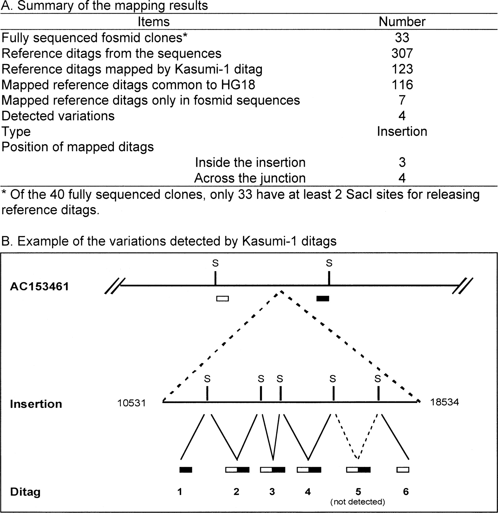 Kasumi-1 genome contains the variations in the GM15510 genome detected by fosmid sequences. (A) Summary of the mapping between the Kasumi-1 ditags and the reference ditags extracted from the variations in the 33 fully sequenced fosmid clones. Four insertion variations were detected by Kasumi-1 ditags that detected the junction and the insertion sequences. (B) Example of the insertion confirmed by ditags. Variation AC153461 contains an 8002-bp insertion. Six ditags detected this insertion, four of which were within the insertion, and two crossed the junctions between the normal sequences and the insertion. (S) SacI restriction site.