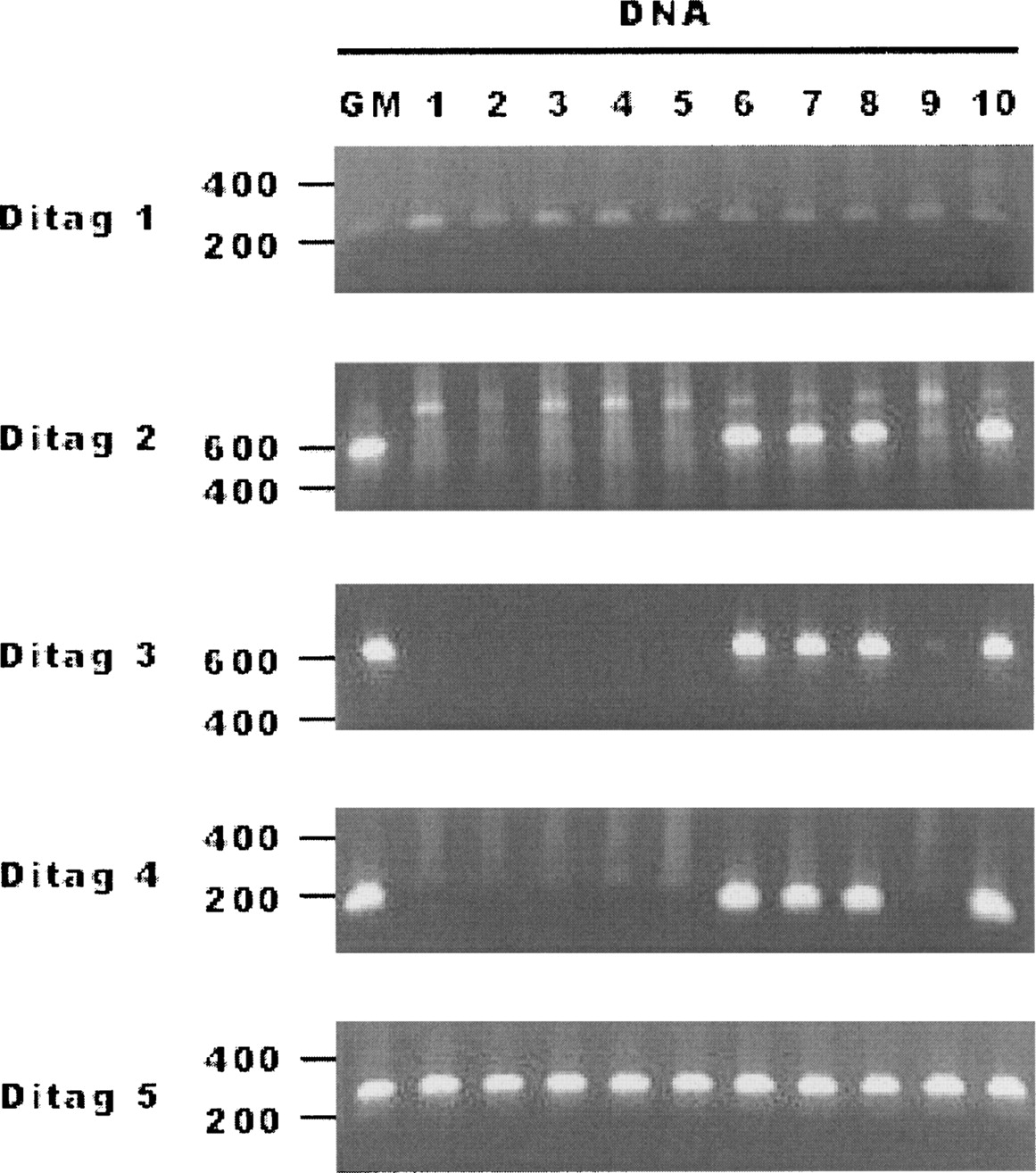 Ditag-detected genome variations in multiple individual genomes. Variations in GM15510 detected by five SacI ditags (Supplemental Table 12B) were tested in a panel of 10 DNA samples (Coriell). (GM) GM15510 DNA was used as the positive control. The results show that two variations are present in all 10 individual genomes and three variations exist in only four individual genomes.