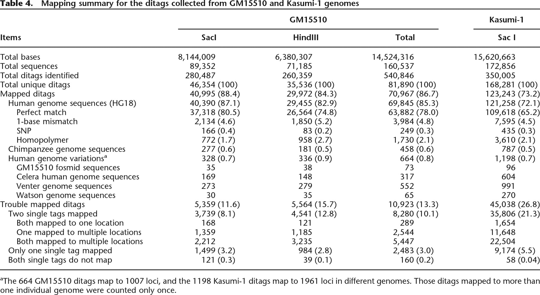 aThe 664 GM15510 ditags map to 1007 loci, and the 1198 Kasumi-1 ditags map to 1961 loci in different genomes. Those ditags mapped to more than one individual genome were counted only once.