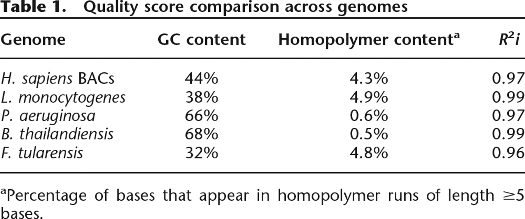 aPercentage of bases that appear in homopolymer runs of length ≥5 bases.