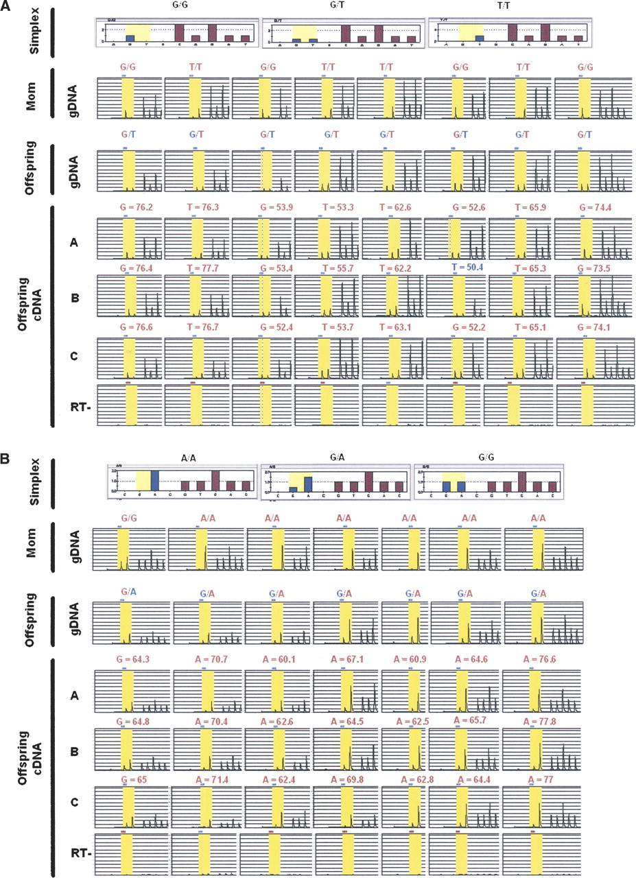 Parent-of-origin analysis of genes showing ASE in a replicate set. (A) NLRP2 demonstrates preferential expression of the maternal allele in placentas of eight different individuals. (B) OSBPL1A demonstrates preferential expression of the maternal allele in placentas of seven (shown) out of 10 different individuals. In both A and B, the first row demonstrates the simplex files for the three possible genotypes of the pyrosequencing assay. The next two rows demonstrate the pyrosequencing raw data files for the gDNA of the mother (homozygous) and the offspring (heterozygous), respectively. The final rows demonstrate the ASE (in triplicate) from cDNA of the cases and the corresponding RT− control for each assay. In all cases, the maternal allele (red) is preferentially expressed compared with the paternal allele (blue). The columns represent individual sample sets.