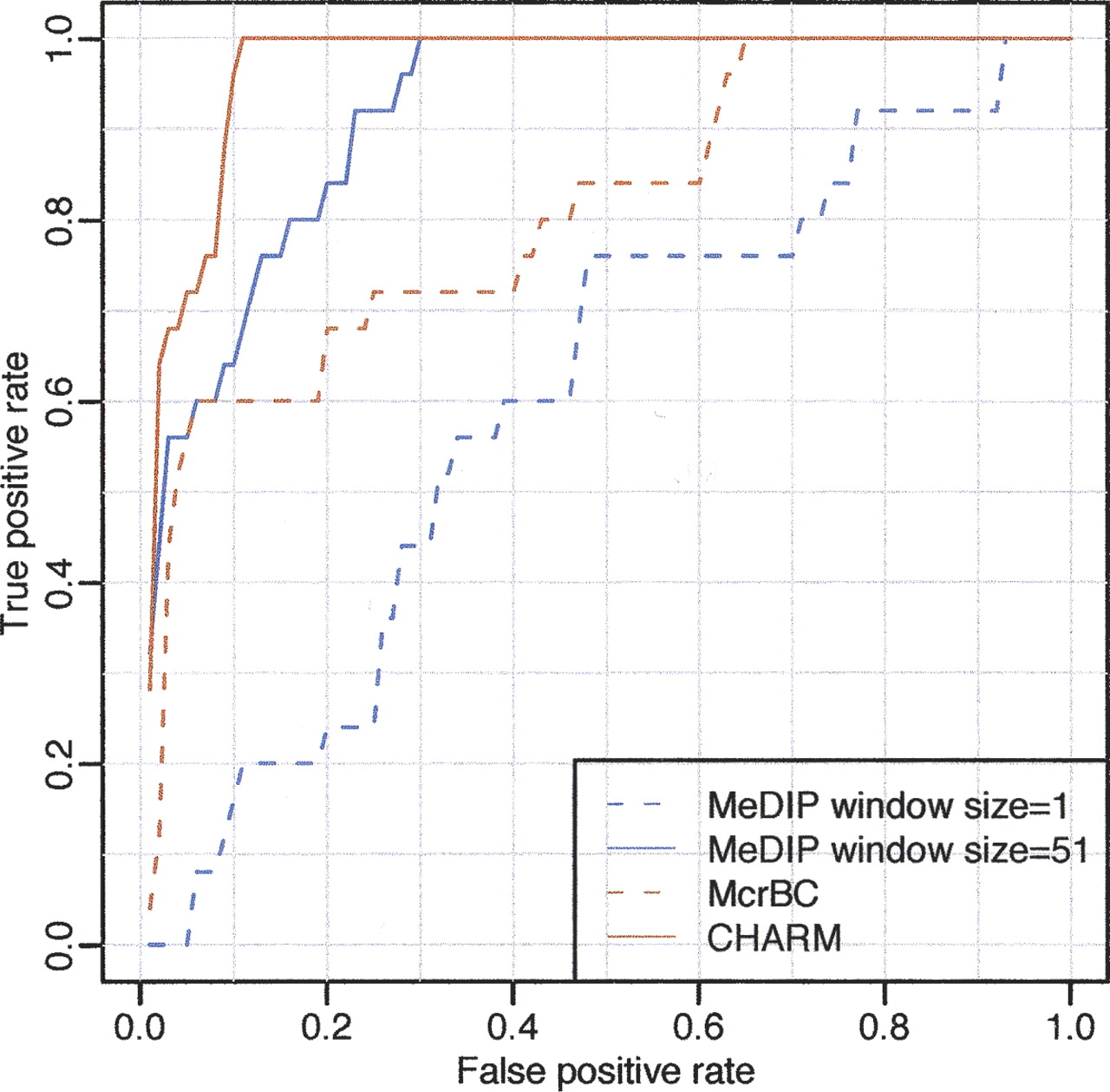 ROC curve demonstrating the advantage of genome-weighted smoothing. We considered all gene regions represented on the Illumina platform. For the purpose of ROC calculation, highly methylated and unmethylated regions were compared. If all probes in the region showed on the reference Illumina platform a methylation percentage >90%, the region was considered a true positive. If all probes in the region reported a percentage <10% they were considered a true negative. To define a positive from the microarray data using a window size of 1, a cut-off for the M-values was chosen. If any probe intensity within the region was above that cut-off, it was defined as positive. A running median with a window size of 51 was then analyzed and defined a positive in the same way, except that the smoothed results instead of the individual probe intensities were used. Results are shown for both McrBC and MeDIP. For a given threshold, the true-positive rate is defined as the percentage of true-positive regions for which the microarray data surpasses that threshold. The false-positive rate is defined in the same way but for the true-negative regions.