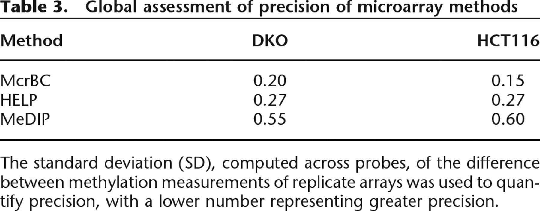 The standard deviation (SD), computed across probes, of the difference between methylation measurements of replicate arrays was used to quantify precision, with a lower number representing greater precision.