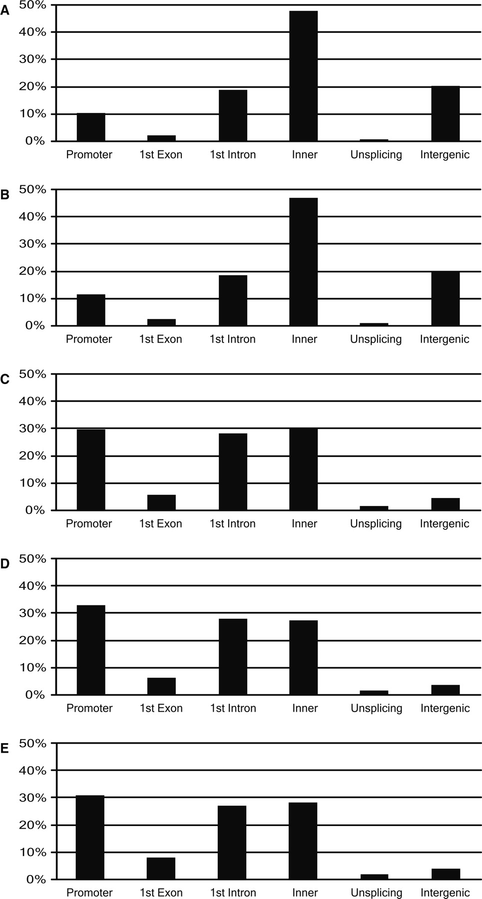 Distribution of positions of hypomethylated sites in promoter, 1st exon, 1st intron, inner region of gene, and region containing no transcribed sequences: (A) MCF7, (B) MDA-MB-231, (C) tumor breast, (D) normal breast, and (E) normal brain. The extensively hypomethylated sites in MCF7 and MDA-MB-231 genomes are enriched in the intragenic and intergenic regions (P < 0.01, Fisher’s exact test). By contrast, normal tissue genomes are enriched in the promoter, exon 1, and intron 1 close to the 5′ end of the gene (P < 0.01, Fisher’s exact test).