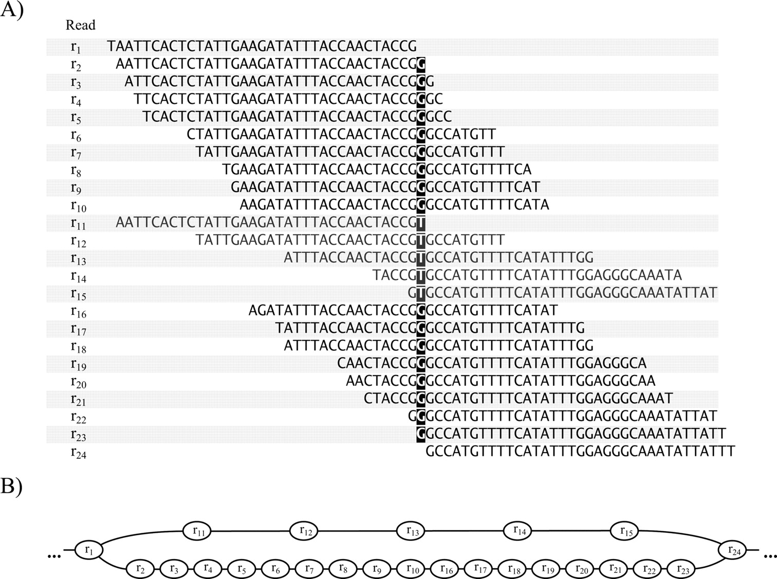 Fixing bubbles. This illustration shows a bubble caused by a polymorphism. This example is one of the many that can be found in the overlap graph constructed from the Staphylococcus aureus strain MW2 reads data set. (A) The 24 reads implicated in the bubble are shown. r1 and r24 are the ends of the bubble, which is 35 × 2 + 1 bp in length. Reads showing the polymorphism are r11 to r15. None of these reads have exact occurrence in the published genome of S. aureus strain MW2 sequence. (B) The corresponding transitively reduced overlap graph is shown. By considering the read redundancy, the total number of reads in the low and highly covered side is five and 27, respectively. Fixing of bubbles consists in removing nodes forming the less covered side of the bubble.