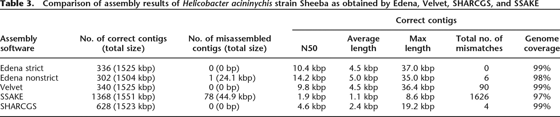 Comparison of assembly results of Helicobacter acininychis strain Sheeba as obtained by Edena, Velvet, SHARCGS, and SSAKE