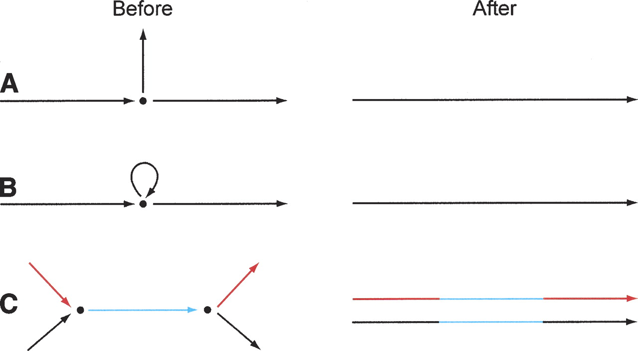 Editing assembly graphs. Assembly graphs are edited to improve their quality. (A) Clean-up operations, for example, removal of short “hanging ends,” like the middle vertical edge; other clean-up operations include deletion of sequence that is not covered by paired reads and deletion of tiny graph components. (B) Disambiguation operations. Here, given sufficient paired-read links from the left to the right edge, the precise number of copies of the loop edge may be determined, and it may then be unrolled, thereby replacing all three edges by a single edge. (C) Pulling-apart operations. If paired-read links go from the left red edge to the right red edge, and from the left black edge to the right black edge, but not from red to black or black to red, the middle edge may be duplicated, yielding as output two composite edges.