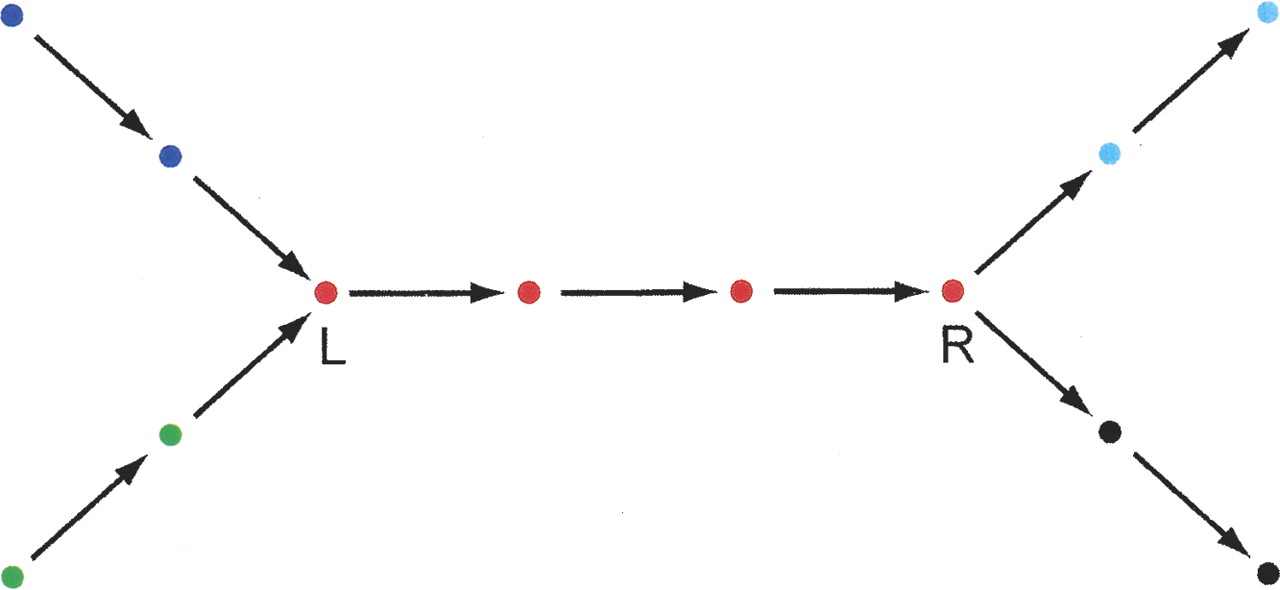Unipaths in a genome. A hypothetical genome has 12 K-mers, represented here as vertices. There are five unipaths, one for each of five colors. Vertex L has indegree 2 and vertex R has outdegree 2, delineating branches.