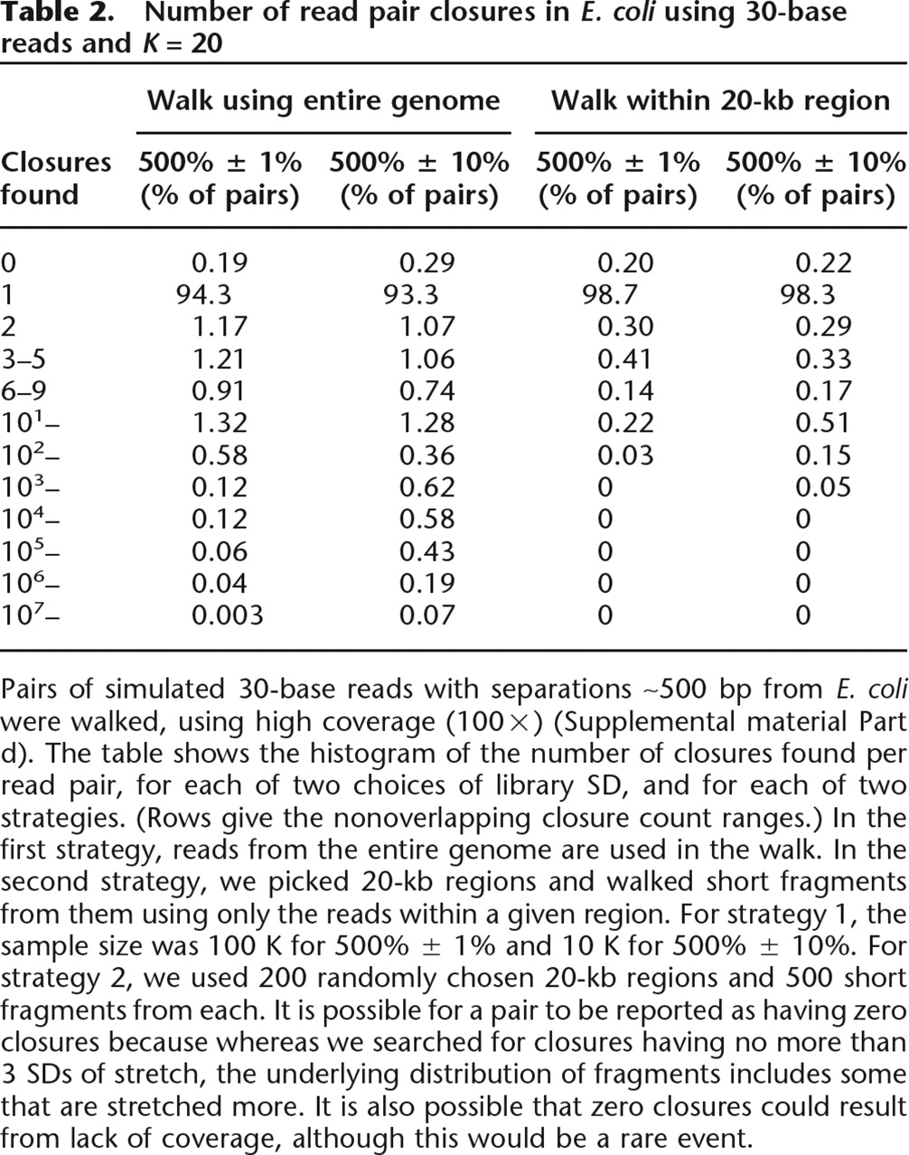 Pairs of simulated 30-base reads with separations ∼500 bp from E. coli were walked, using high coverage (100×) (Supplemental material Part d). The table shows the histogram of the number of closures found per read pair, for each of two choices of library SD, and for each of two strategies. (Rows give the nonoverlapping closure count ranges.) In the first strategy, reads from the entire genome are used in the walk. In the second strategy, we picked 20-kb regions and walked short fragments from them using only the reads within a given region. For strategy 1, the sample size was 100 K for 500% ± 1% and 10 K for 500% ± 10%. For strategy 2, we used 200 randomly chosen 20-kb regions and 500 short fragments from each. It is possible for a pair to be reported as having zero closures because whereas we searched for closures having no more than 3 SDs of stretch, the underlying distribution of fragments includes some that are stretched more. It is also possible that zero closures could result from lack of coverage, although this would be a rare event.