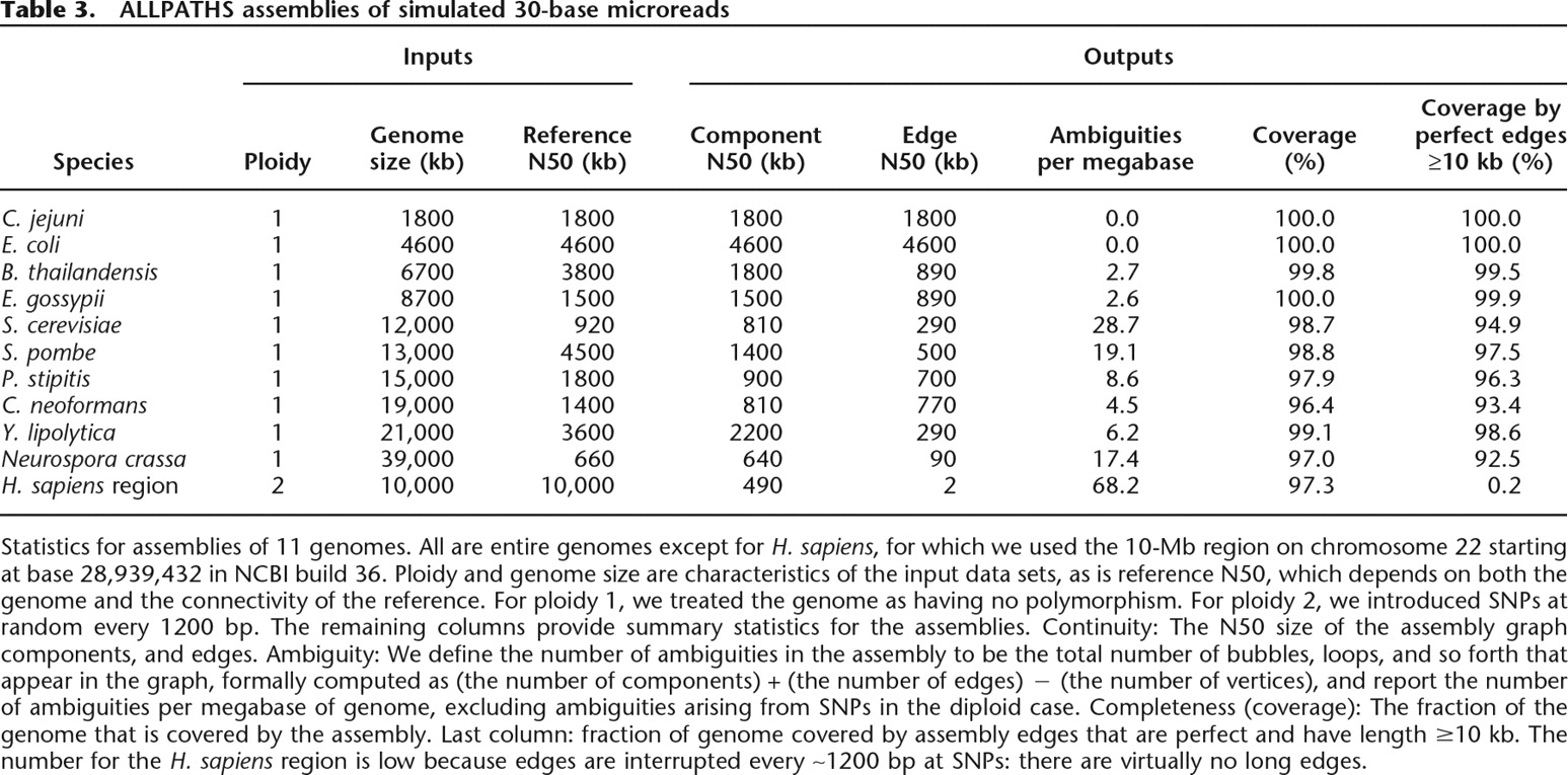 Statistics for assemblies of 11 genomes. All are entire genomes except for H. sapiens, for which we used the 10-Mb region on chromosome 22 starting at base 28,939,432 in NCBI build 36. Ploidy and genome size are characteristics of the input data sets, as is reference N50, which depends on both the genome and the connectivity of the reference. For ploidy 1, we treated the genome as having no polymorphism. For ploidy 2, we introduced SNPs at random every 1200 bp. The remaining columns provide summary statistics for the assemblies. Continuity: The N50 size of the assembly graph components, and edges. Ambiguity: We define the number of ambiguities in the assembly to be the total number of bubbles, loops, and so forth that appear in the graph, formally computed as (the number of components) + (the number of edges) − (the number of vertices), and report the number of ambiguities per megabase of genome, excluding ambiguities arising from SNPs in the diploid case. Completeness (coverage): The fraction of the genome that is covered by the assembly. Last column: fraction of genome covered by assembly edges that are perfect and have length ≥10 kb. The number for the H. sapiens region is low because edges are interrupted every ∼1200 bp at SNPs: there are virtually no long edges.