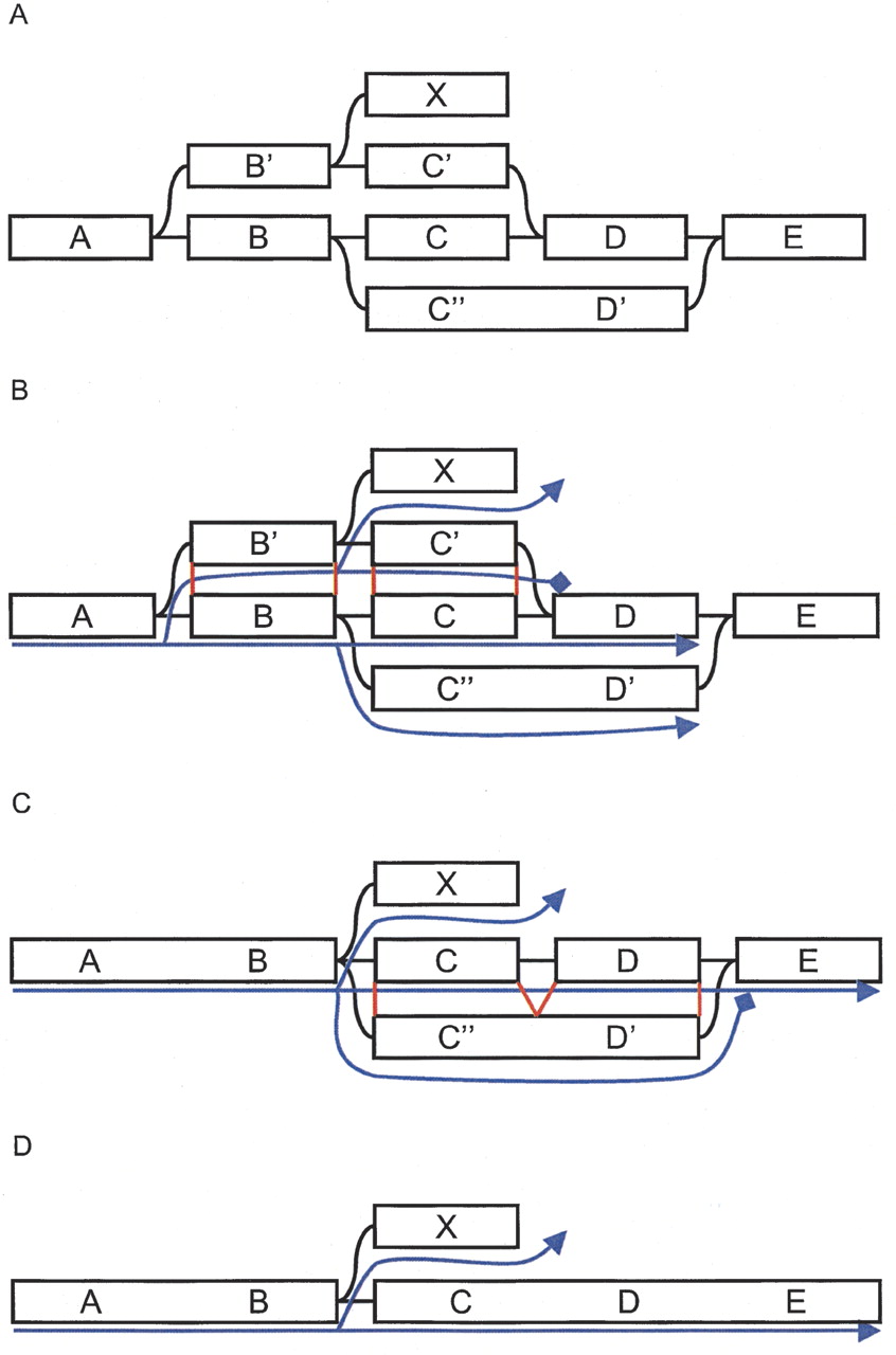 Example of Tour Bus error correction. (A) Original graph. (B) The search starts from A and spreads toward the right. The progression of the top path (through B′ and C′) is stopped because D was previously visited. The nucleotide sequences corresponding to the alternate paths B′C′ and BC are extracted from the graph, aligned, and compared. (C) The two paths are judged similar, so the longer one, B′C′, is merged into the shorter one, BC. The merging is directed by the alignment of the consensus sequences, indicated in red lines in B. Note that node X, which was connected to node B′, is now connected to node B. The search progresses, and the bottom path (through C′ and D′) arrives second in E. Once again, the corresponding paths, C′D′ and CD are compared. (D) CD and C′D′ are judged similar enough. The longer path is merged into the shorter one.