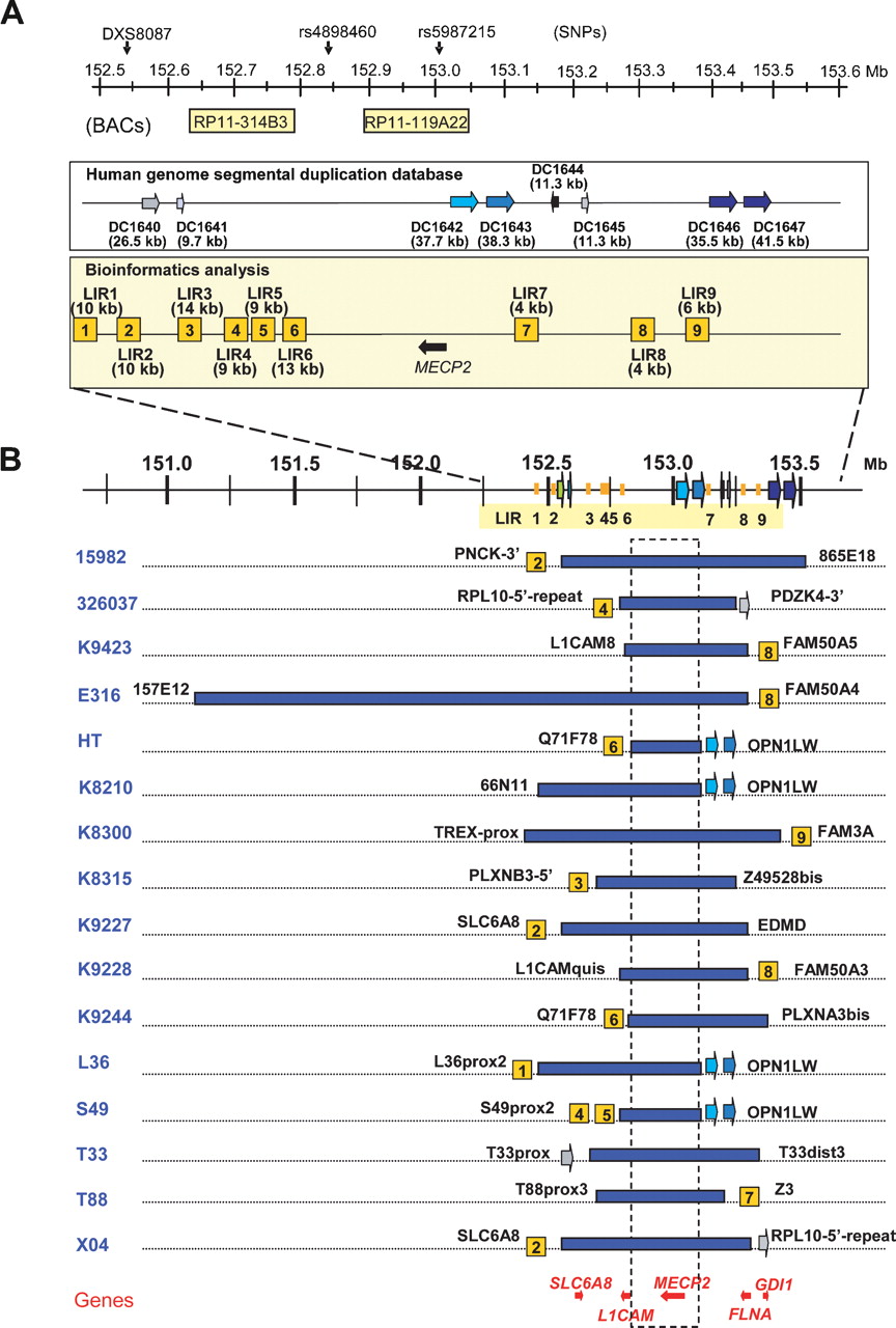 Bioinformatics analysis of the breakpoint regions and mapping of the duplications in the 16 patients. (A) Schematic overview of the repeat structures that coincide with duplication breakpoints in a 1-Mb region flanking MECP2 (152.55–153.55 Mb). Position and size of interchromosomal (DC1640 and DC1641) and intrachromosomal (DC1642, DC1643, DC1644, DC1645, DC1646, and DC1647) segmental duplications are depicted as reported in the Human genome segmental duplication database. In the Bioinformatics analysis box, LIR1 to LIR9 represent the breakpoint regions enriched for interspersed repeats with their lengths in brackets. The position of the BAC clones RP11-314B3 (152.63 Mb) and RP11-119A22 (152.90 Mb) used for FISH analysis is shown, as well as the position of DXS8087 (152.54 Mb) and the SNPs rs4898460 (152.83 Mb) and rs5987215 (153.05 Mb), used to investigate the origin of the duplications. (B) Duplication breakpoint mapping in the 16 patients (indicated on the left). Horizontal blue bars represent duplicated regions at Xq28. Size and location of each duplication were determined by iterative rounds of qPCR. Positions and sizes of all duplications were different. The colocalization of the breakpoint regions with the repeat structures, if present, is indicated with the name of the last duplicated qPCR primer set mentioned next to it (primer sequences can be found in Supplemental Table S1). The genes for which mutations are known to result in XLMR that also map in this region are shown at the bottom. The commonly duplicated region is boxed and includes only one XLMR gene, MECP2. Except for E316, all duplications lie within a 1.2-Mb region.