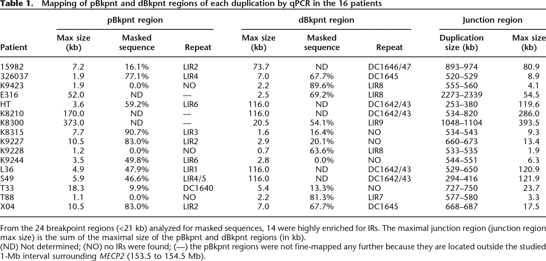 (ND) Not determined; (NO) no IRs were found; (—) the pBkpnt regions were not fine-mapped any further because they are located outside the studied 1-Mb interval surrounding MECP2 (153.5 to 154.5 Mb).