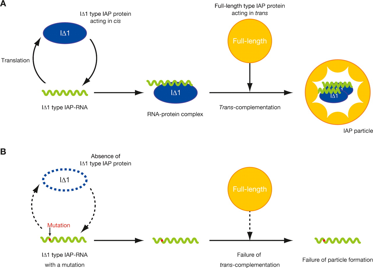 Model for possible role of nonautonomous type IAP protein. (A) IAP particle formation mediated by IΔ1 type IAP protein. Transcript of IΔ1 type IAP element is bound by IΔ1 type IAP protein immediately after translation. The full-length type autonomous IAP protein is recruited to the RNA–protein complex through interaction between IΔ1 type and full-length type IAP proteins, leading to the formation of transposition competent IAP particle. (B) Inefficient formation of IAP particle in the absence of IΔ1 type IAP protein. Accessibility of full-length type autonomous IAP protein to IΔ1 type IAP transcript is impaired due to the lack of IΔ1 type IAP protein. Note that the conformation of the IΔ1 type IAP protein in the IAP particle is unknown and only schematically drawn here.