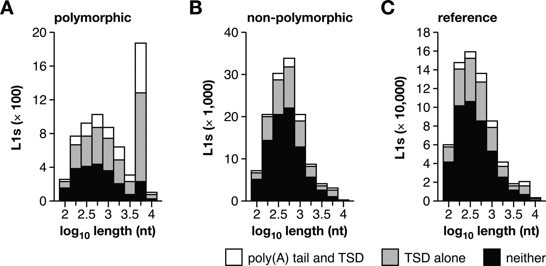 Polymorphic L1s are bona fide products of recent retrotransposition. The length distribution of (A) polymorphic L1s (absent from at least one of the unassembled strains), (B) nonpolymorphic L1s (present in all five strains), and (C) reference L1s (present in the C57 genome) is presented for elements with both a poly(A) tail and TSD (white), TSD alone (light gray), or neither (black). Polymorphic L1s are much more likely to be full length and to have both a poly(A) tail and TSD. See Supplemental Figure 3 and Supplemental Table 6.