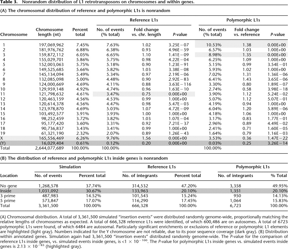 (A) Chromosomal distribution. A total of 3,361,500 simulated “insertion events” were distributed randomly genome-wide, proportionally matching the relative lengths of chromosomes as expected. A total of 666,328 reference L1s were identified, of which 600,486 are on autosomes. A total of 6723 polymorphic L1s were found, of which 6484 are autosomal. Particularly significant enrichments or exclusions of reference or polymorphic L1 elements are highlighted (light gray). Numbers indicated for the Y chromosome are not reliable, due to its poor sequence coverage (dark gray). (B) Distribution within annotated genes. Simulation again had 3,361,500 “insertion events” distributed randomly genome-wide. The P-value for the comparison of reference L1s inside genes, vs. simulated events inside genes, is <1 × 10−100. The P-value for polymorphic L1s inside genes vs. simulated events inside genes is 2.13 × 10−83 (highlighted gray).