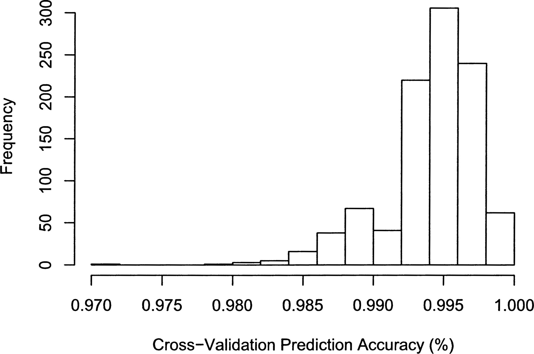 Distribution of haplogroup prediction accuracy as determined using bootstrap cross-validation of the linear discriminant function analysis on sequences from the common European haplogroups in mtDB.