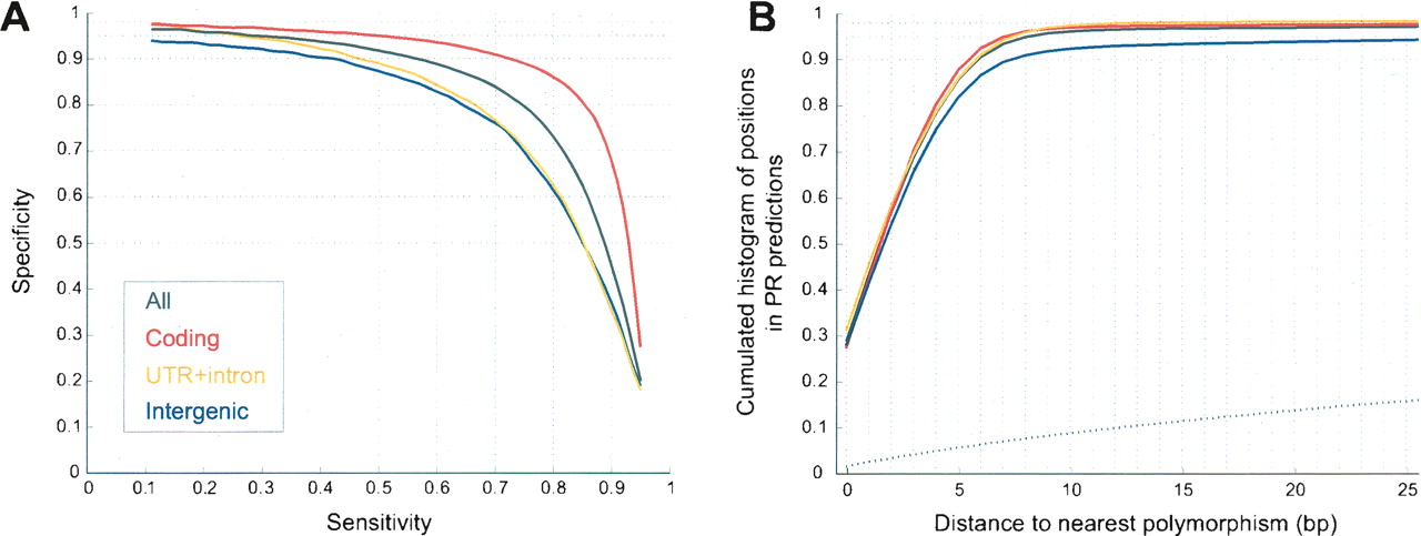 Relationship between specificity and sensitivity for PR predictions with overlap criteria λ = 75%. (A) Specificity–sensitivity curves averaged over cross-validation test subsets for different sequence types (for color code, see inset). PRs that contained more than one sequence type were assigned to the type comprising the majority of the prediction. (B) Specificity at the nucleotide level as calculated for each position within a prediction. Deleted nucleotides and SNP positions were assigned a distance of 0. A cumulative histogram of these distances is displayed, showing that, e.g., more than 90% of all nucleotides in PR predictions are within six nucleotides to a known polymorphism. The dotted black line indicates the relationship expected by chance (i.e., predictions were assigned to random genomic locations for calculating distances).