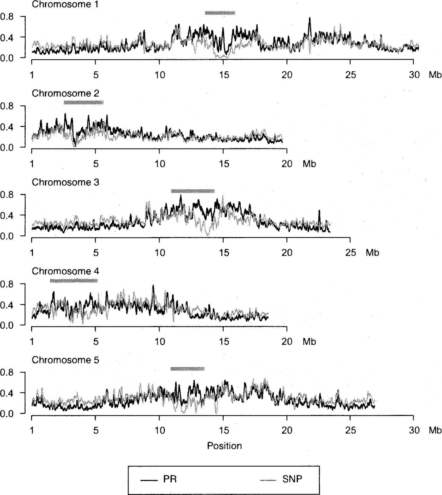 Genome-wide patterns of polymorphism in PRs and MBML2 SNPs. A sliding window of 100 kb was used, with values for every 10,000th position plotted. The Y-axis displays the fraction of bp in each window included within PRs nonredundantly over all accessions (black line), and the two measures of polymorphism are broadly correlated (Supplemental Fig. S7). To facilitate visualization, the analogous measure for the SNP data was multiplied by 50 (gray line). Thick gray bars indicate the approximate positions of centromeres as defined by repeat content in an earlier study (Clark et al. 2007).