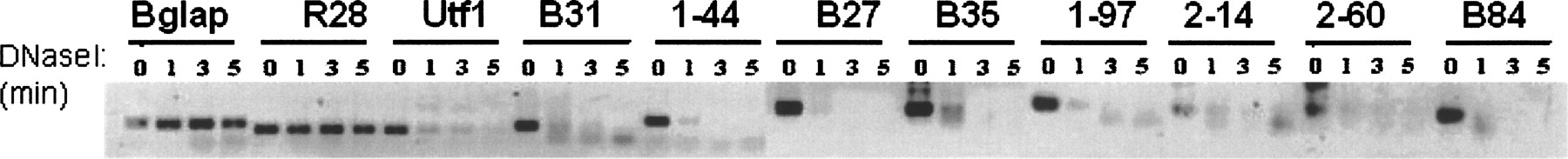 Functional HaeIII DNAs reside in NFRs in situ. F9 cell nuclei were treated for 0,1, 3, or 5 min with DNase I as indicated above each lane. The genomic DNAs were analyzed using PCR and primers spanning the sequences indicated on top.