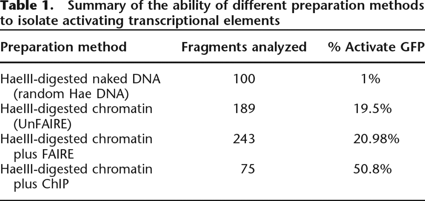 Summary of the ability of different preparation methods to isolate activating transcriptional elements