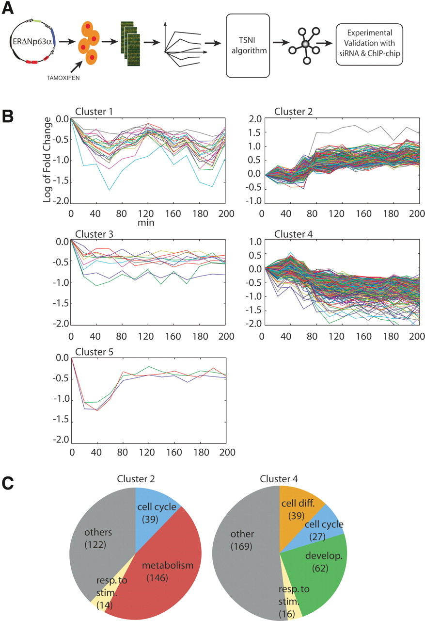 (A) Experimental and computational approach for the identification of TRP63 target genes. ΔNp63α was fused to a modified estrogen receptor domain (ERΔNp63α) and expressed in primary mouse keratinocytes by retroviral infection. Upon treatment with estrogen agonist tamoxifen, total RNA was collected at 10-min intervals for the first hour, and then at 20-min intervals until 4 h. Dynamic gene expression data were filtered by the TSNI algorithm to yield a ranked list of predicted direct TRP63 target genes. Validation was performed by analyzing global gene expression data upon Trp63 knockdown and by ChIP-chip analysis using TRP63 specific antibodies. (B) Expression profiles of a ΔNp63α responsive gene following its activation. Y-axis shows mRNA levels in the ERΔNp63α expressing keratinocytes treated with tamoxifen versus untreated ones expressed as log2 ratio (i.e., +1 corresponds to a twofold increase with respect to the 0 time point [untreated], −1 to a twofold decrease). Gene expression data were clustered using a Hierarchical Clustering approach with correlation metric and average linkage to generate the hierarchical tree. The number of clusters was set to 5. (C) Transcripts in Clusters 2 and 4 were classified using a functional annotation enrichment analysis (see Supplemental Table 3). The biological categories are as indicated in the pie charts, and the number of transcripts for each category is indicated in parenthesis.