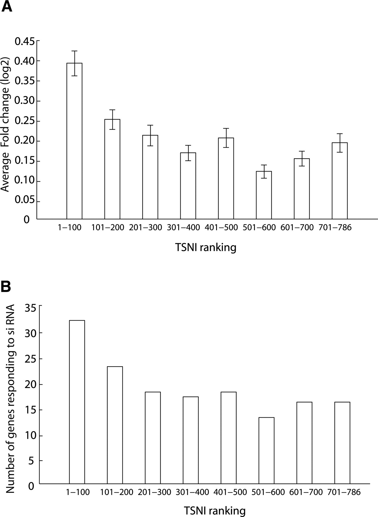 TSNI-predicted TRP63 target genes are enriched for genes responding to Trp63 knockdown. (A) Transcripts were grouped in bins containing 100 transcripts each and indicated on the X-axis (e.g., “1-100” corresponds to the first bin containing genes ranked by TSNI between position 1 and 100). The average fold change in response to Trp63 knockdown of each group of 100 transcripts is computed. Fold change is shown as log2 values. The top 100 TSNI ranked genes changed significantly more (P = 1 × 10–4) than a group of 100 transcripts picked at random. (B) Number of genes responding to Trp63 knockdown (siRNA) for each group of 100 transcripts. The top 100 TSNI ranked transcripts contain significantly more (P = 0.0001) transcripts that respond to Trp63 knockdown than a group of 100 transcripts picked at random.