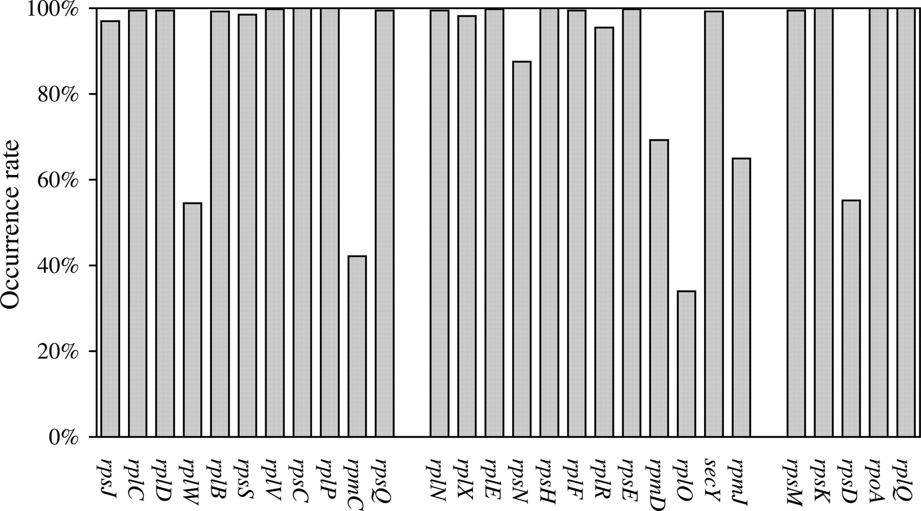 Distribution of the occurrence rate of genes within significant clusters in S10, spc, and alpha operons in the 400 bacterial genomes.